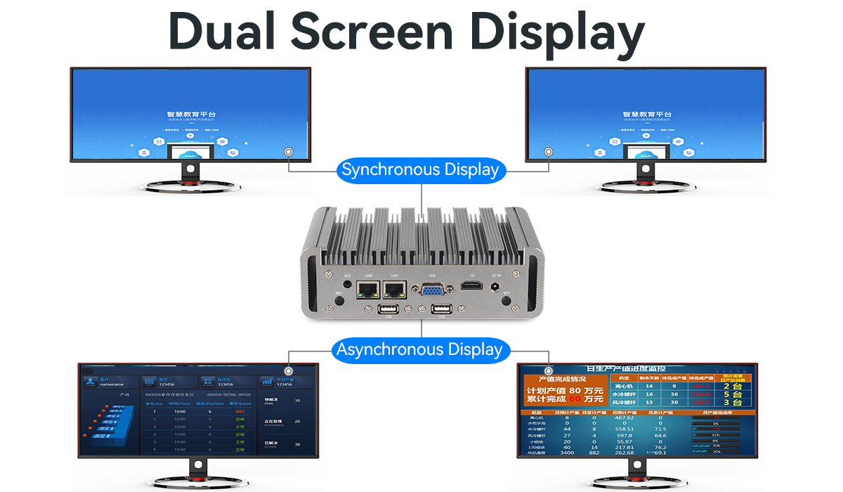 Display Support : 1*VGA, 1*HDMI, support synchronous or asynchronous dual screen display