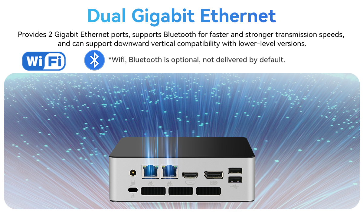 This computer equipped with 2 Gigabit Ethernet ports, supports Bluetooth for faster and stronger transmission speeds, and can support downward vertical compatibility with lower-level versions. Wifi, Bluetooth is optional, not delivered by default.